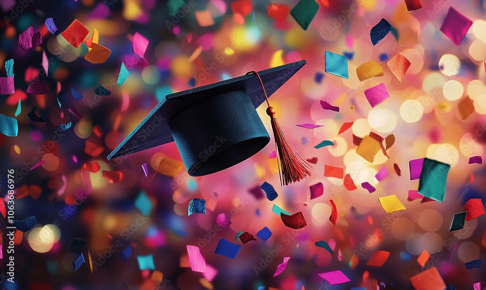 Graduation cap flying amid colorful confetti, celebrating achievements ...
