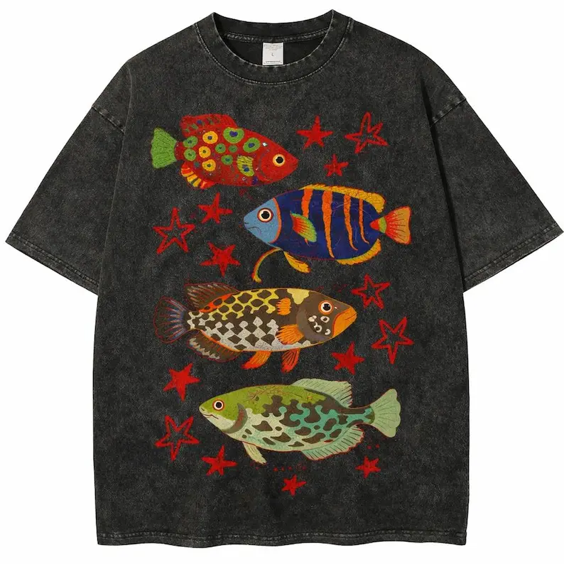 Vintage Washed Colorful Fish T-Shirt, Colorful Streetwear Tee - TikTok Shop