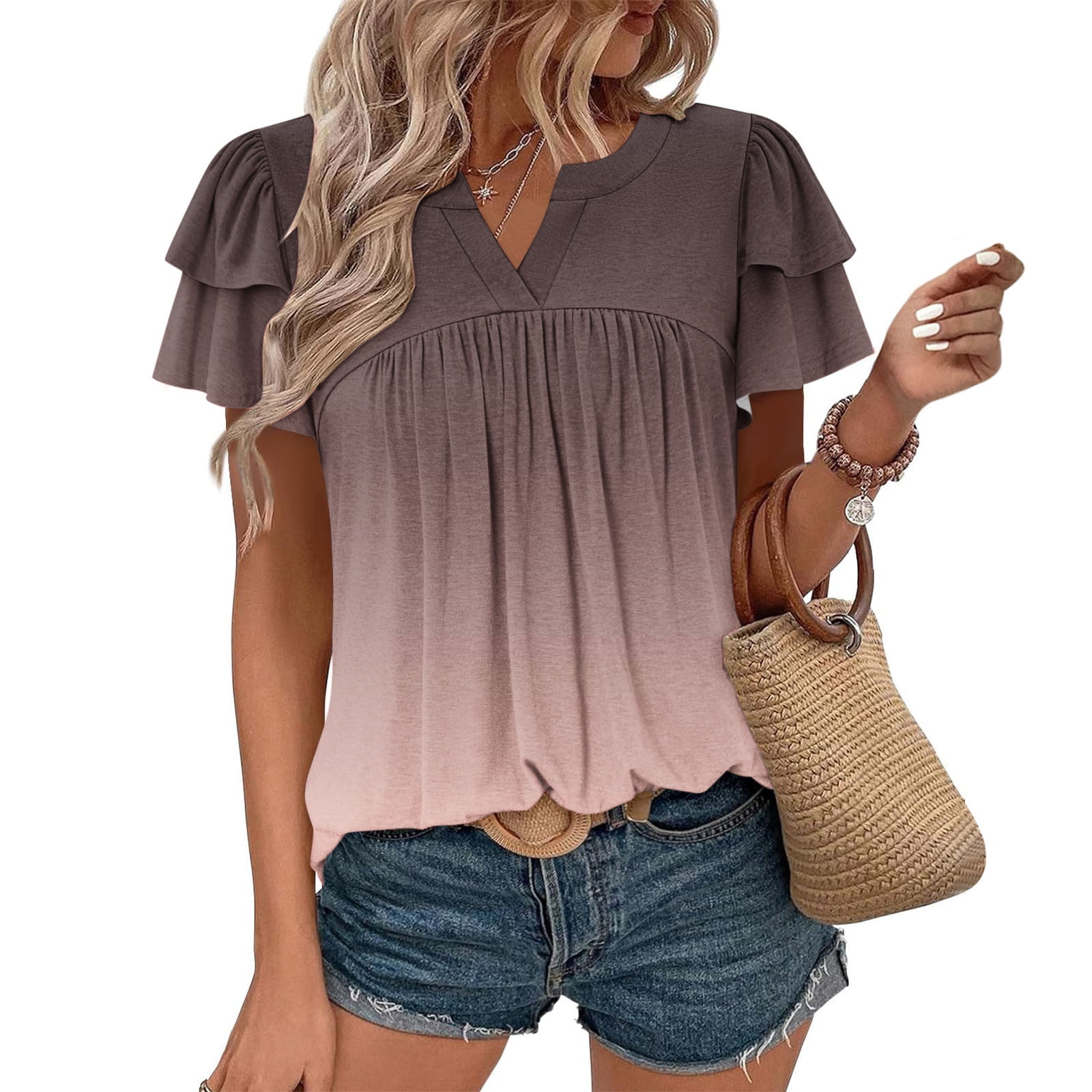 Ayolanni Casual Summer Blouses for Women Gradient Color V-Neck Short ...