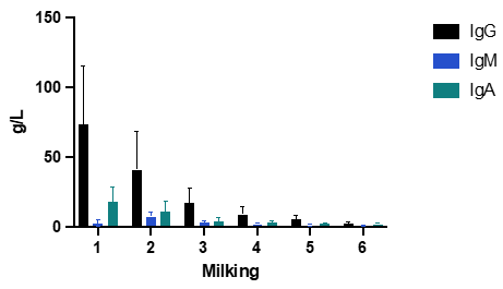 Mean colostral and milk concentrations of IgG (A), IgA (B), and IgM (C ...