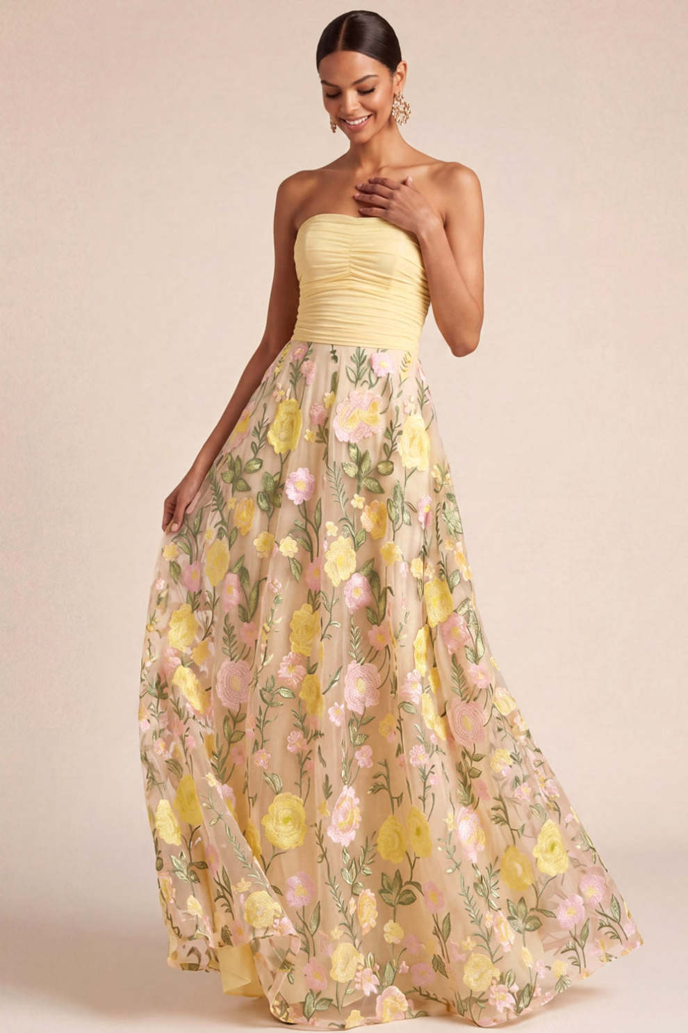 Leely Women Light Yellow Floral A Line Long Formal Dress Strapless ...