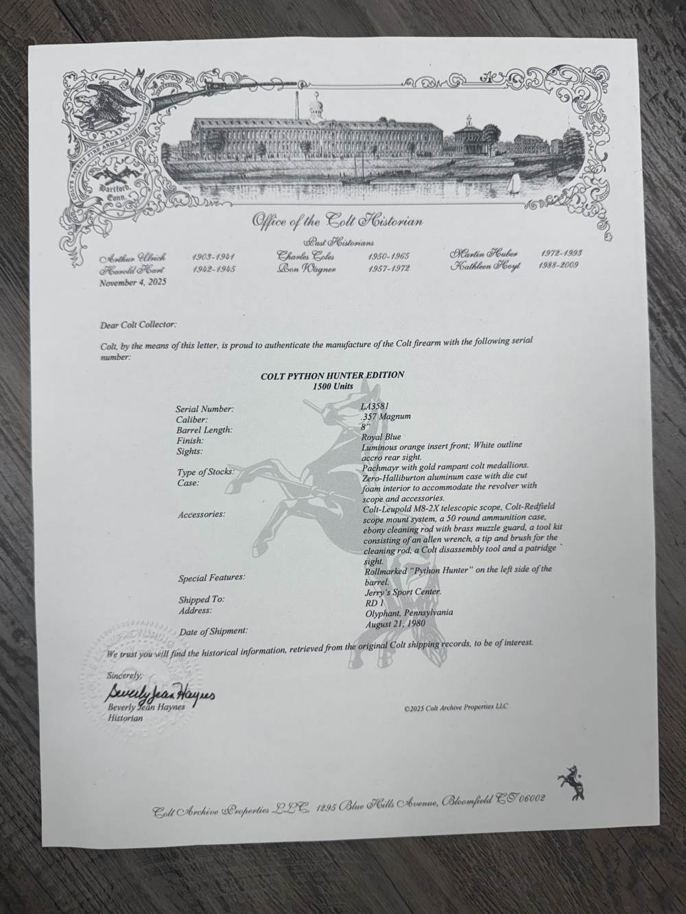 Colt Python Hunter first year of 8” 1500 made - w/ Colt Archives letter ...