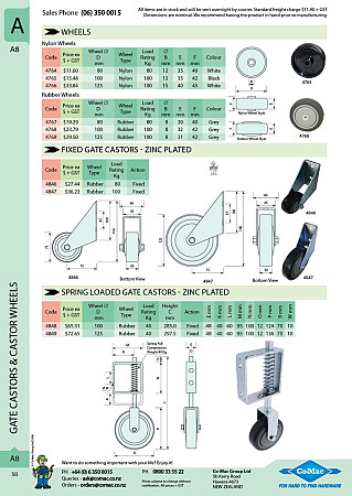 Co-Mac: Nylon Wheels, Fixed Gate Castor, Spring Loaded Castor
