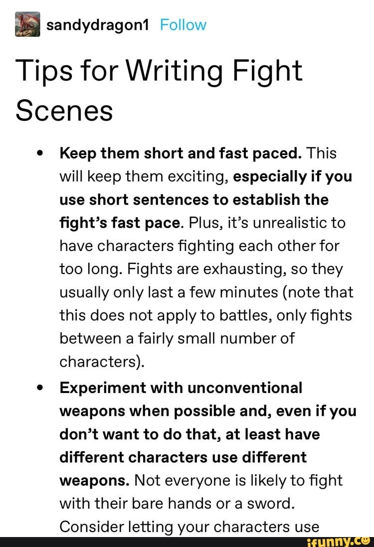 Follow Tips for Writing Fight Scenes Keep them short and fast paced ...