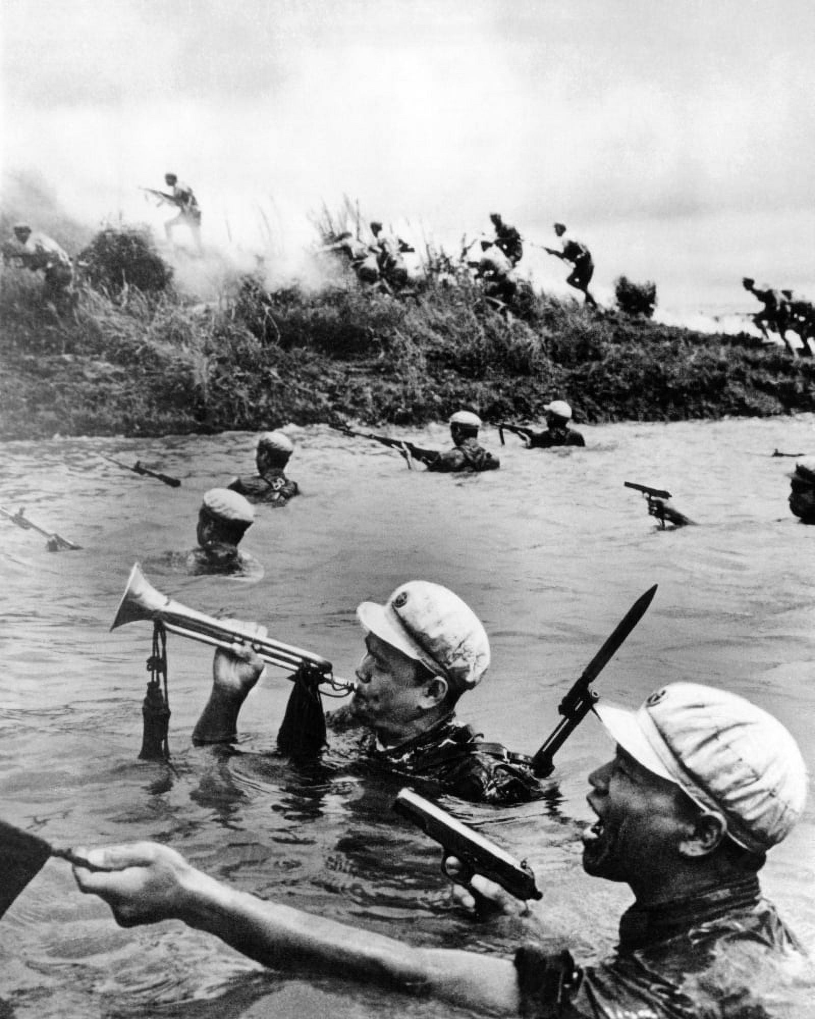 Chinese Communist Soldiers Cross A River During Training. The Bugle Was ...