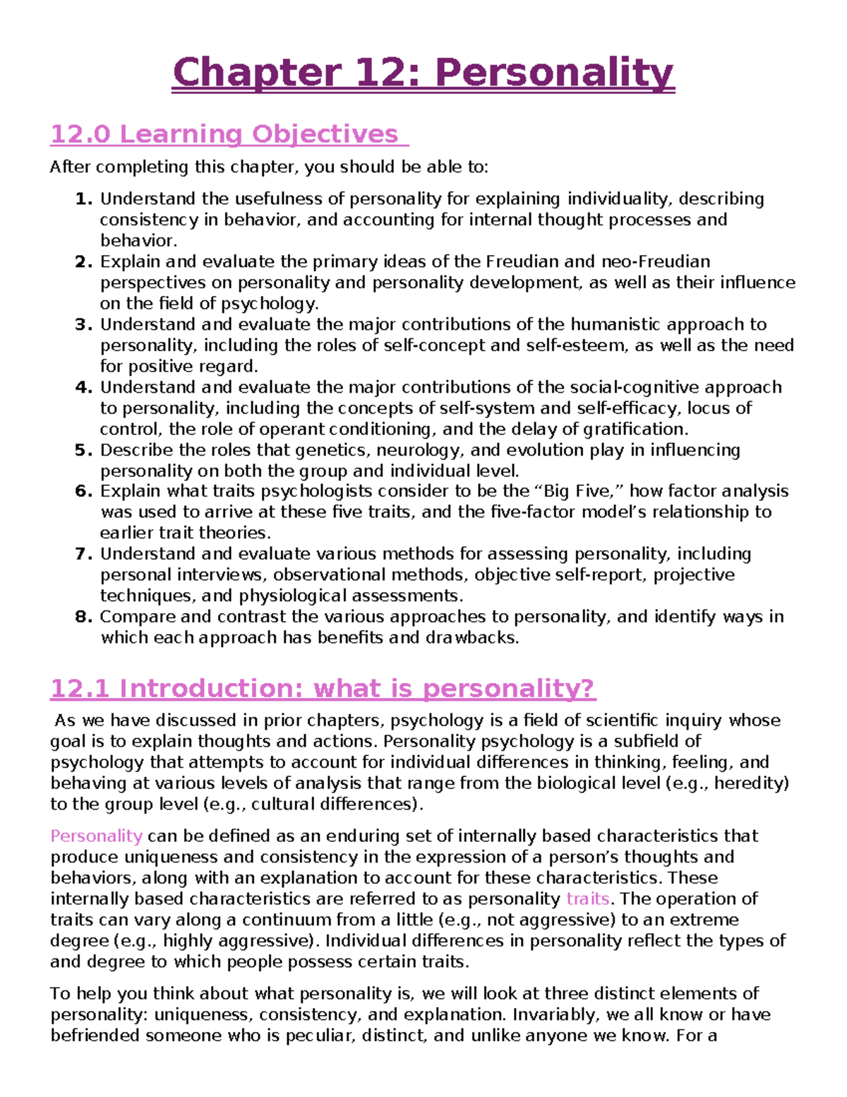 Chapter 12: Understanding Personality - Key Concepts and Theories - Studocu