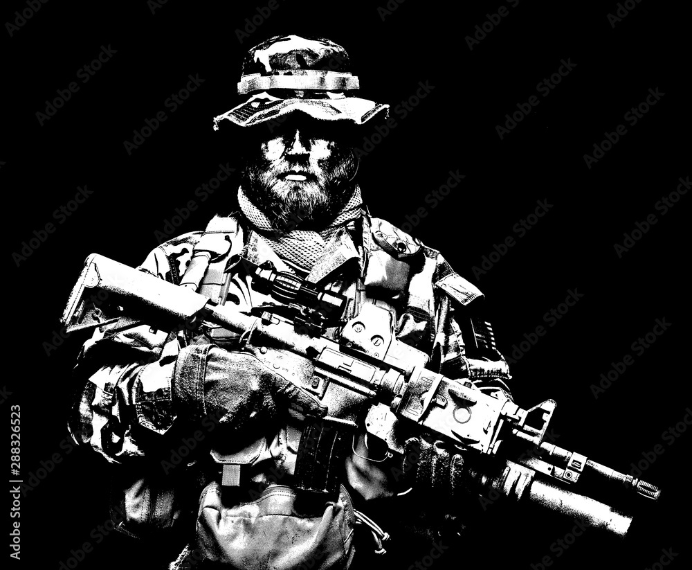 Commando soldier in battle ammunition, armed rifle Stock Photo | Adobe ...