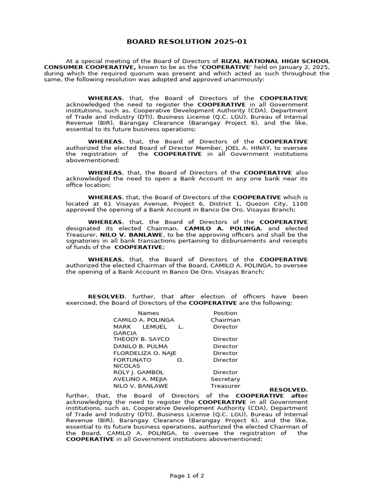 SAMPLE BOARD RESOLUTION | Board Of Directors | Government Information