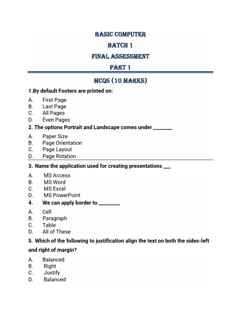 Basic Computer Final Assessment MCQs | PDF | Microsoft Word | Spreadsheet