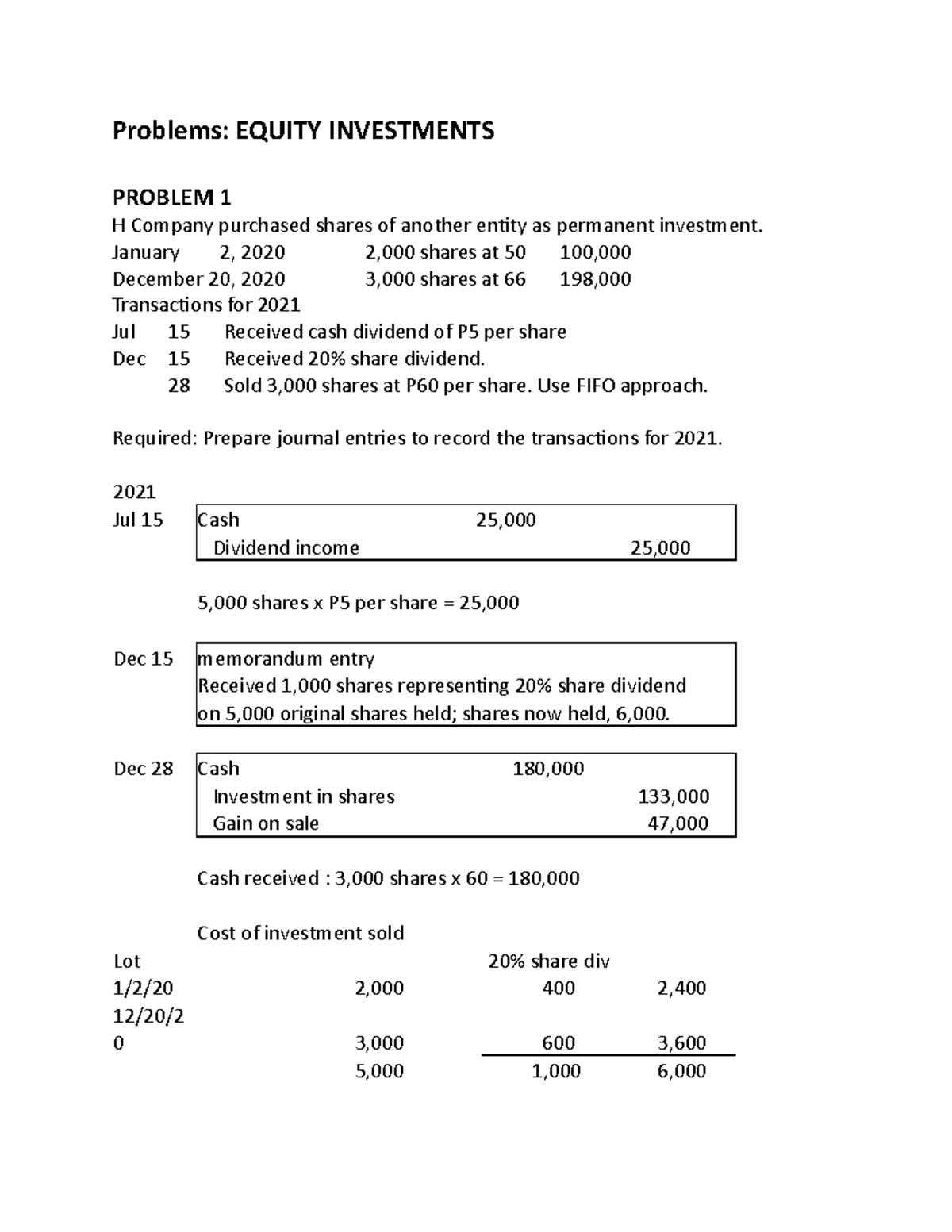 Problems Equity - PROBLEM 1 H Company purchased shares of another ...