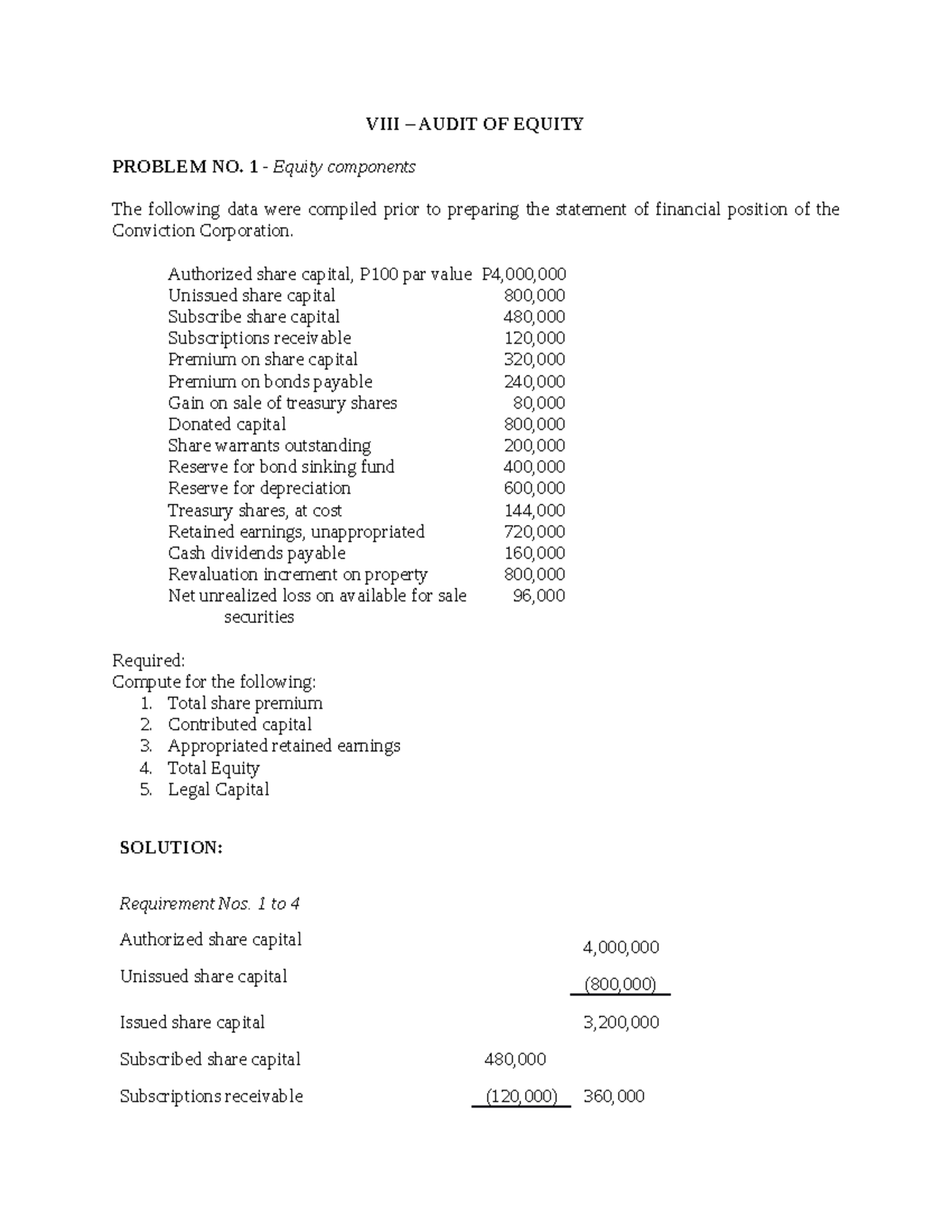 Audit of Equity - ####### VIII – AUDIT OF EQUITY PROBLEM NO. 1 - Equity ...