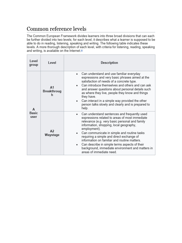 The "Common Reference Levels" as defined by (Council of Europe, 2001 ...