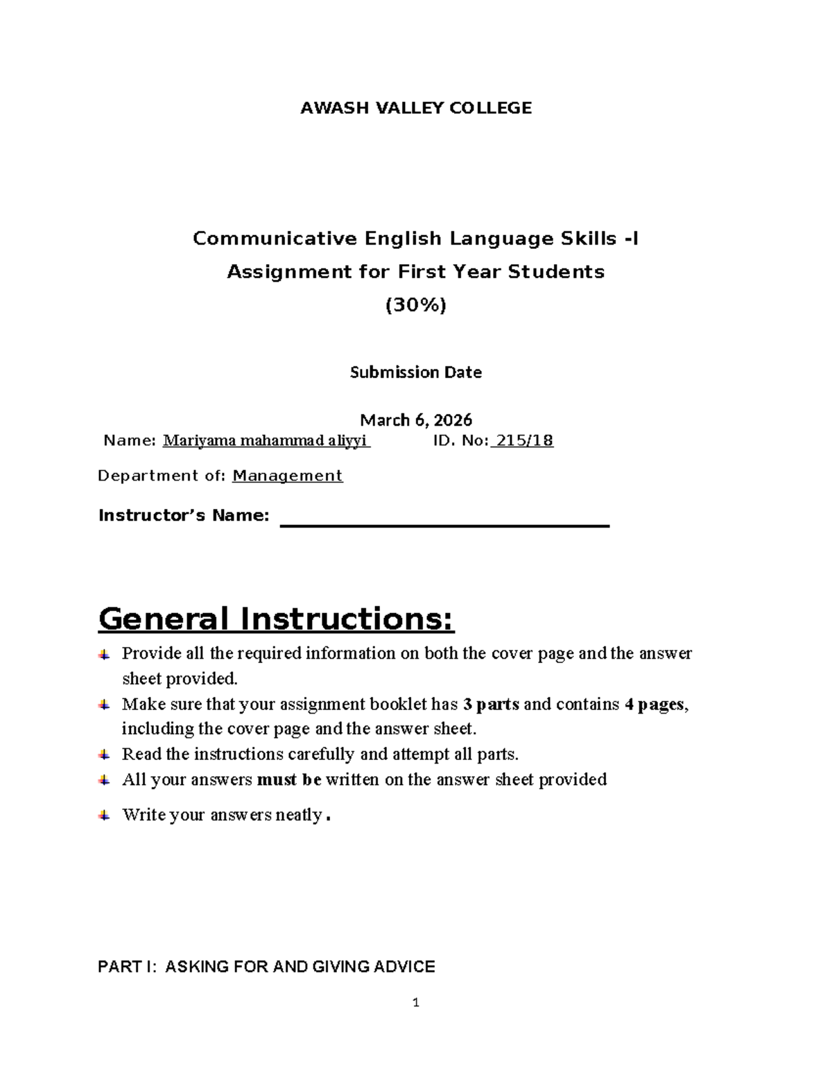 AWASH VALLEY COLLEGE Communicative English I Assignment for 1st Year ...