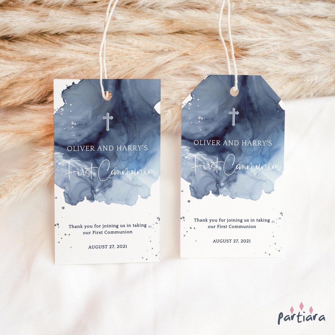 Boys Communion Favors Gift Tag Printable, Navy Blue Silver Baptism ...