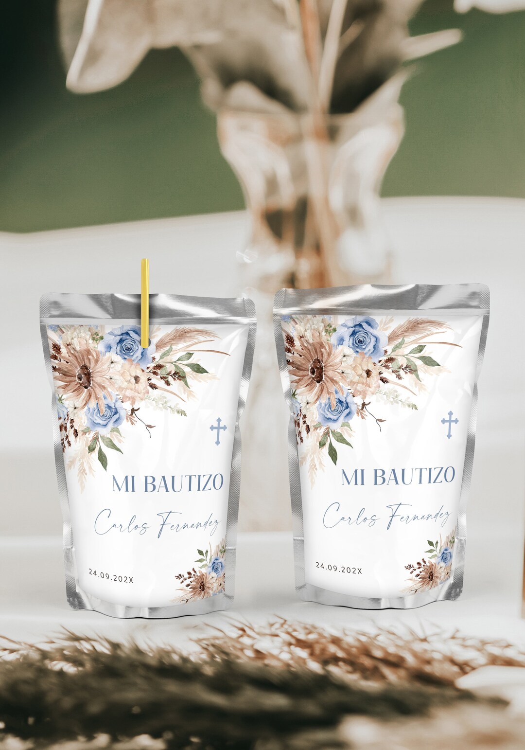 Boy Baptism Party Juice Pouch Label Spanish Template: Boho Blue Beige ...