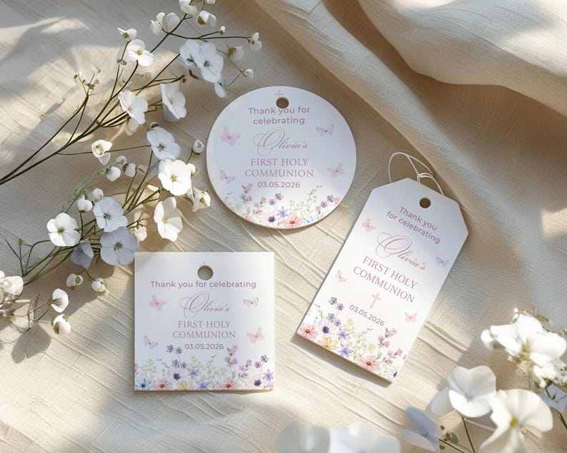 Wildflower First Holy Communion Favor Tag Template, Printable Stickers ...