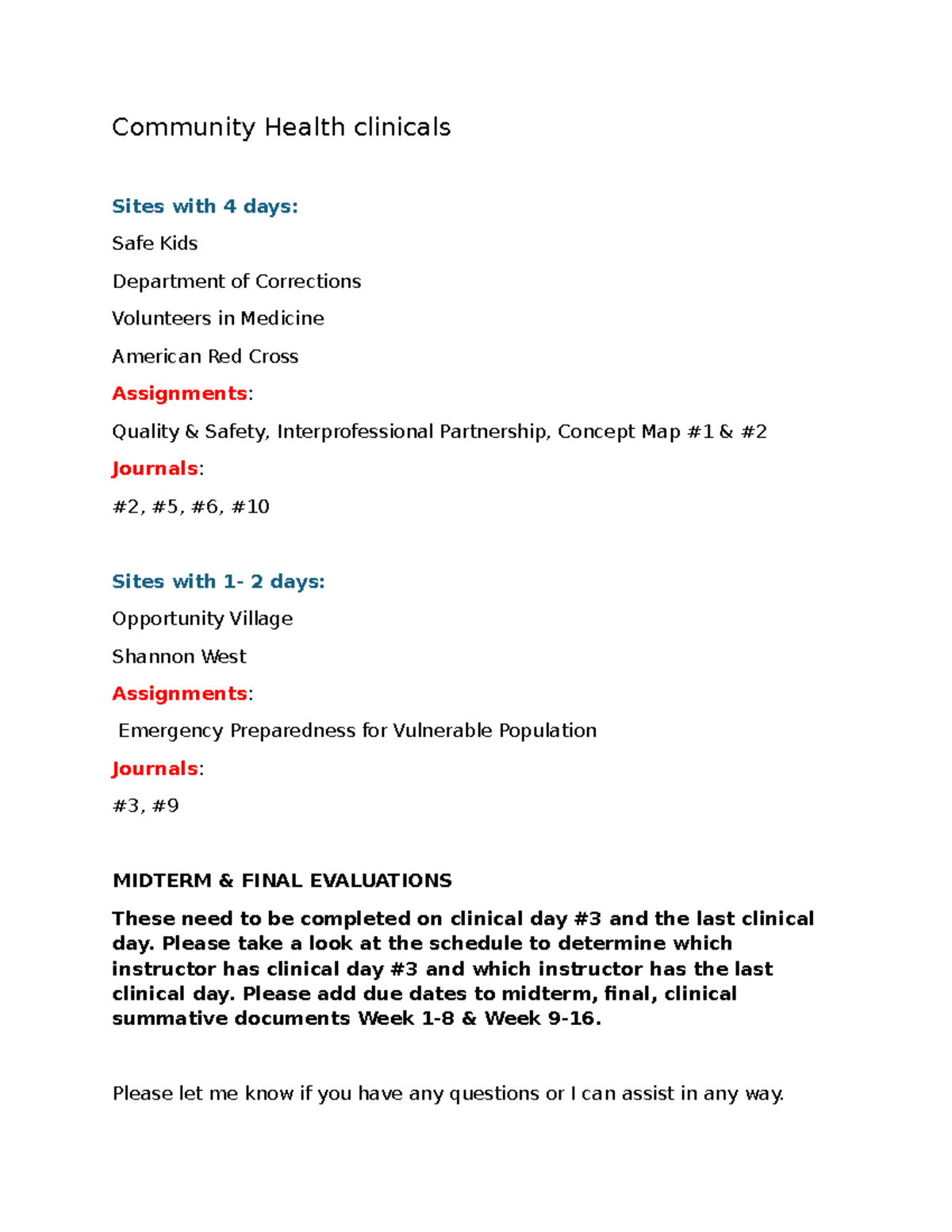 Community Health Clinical Assignment: Midterm & Final Evaluations - Studocu