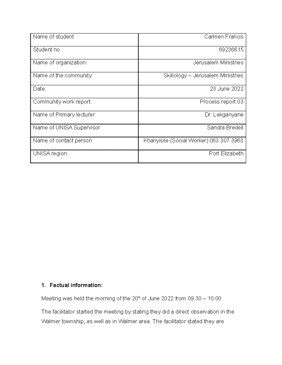 Community work process report 2 - Factual information - Studocu