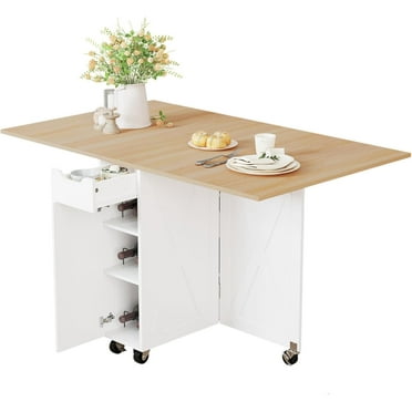 Folding Dining Table with 6 Wheels, Kitchen Table with 2-Layer Storage ...