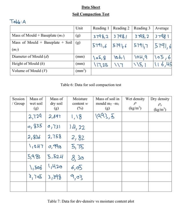 Solved Data Sheet Soil Compaction Test Table:A Unit Reading | Chegg.com
