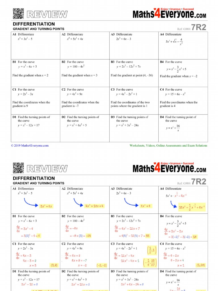 Differentiation Gradients and Turning Points Review Questions | PDF