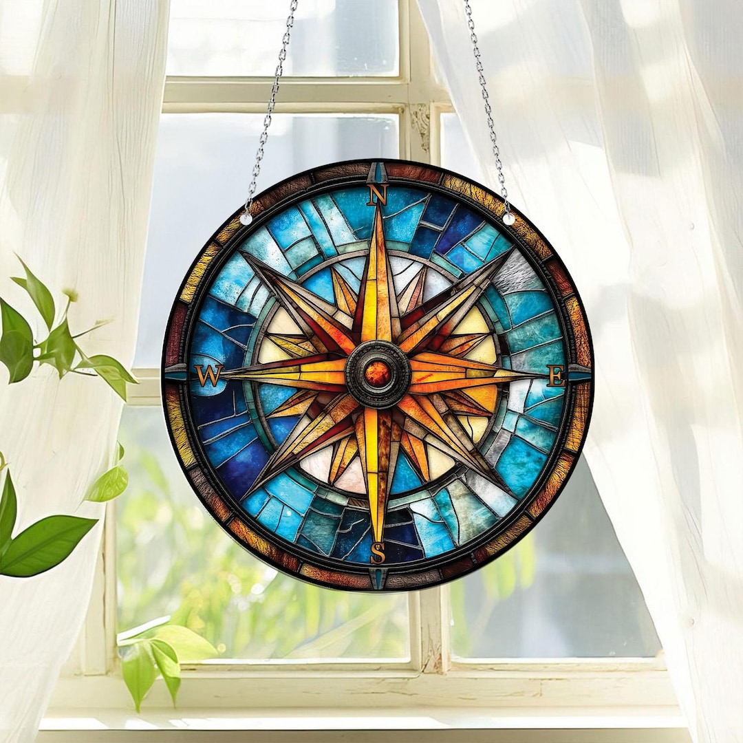 Amazon.com: HAOSUM Compass Rose Stained Glass Window Hangings,Round ...
