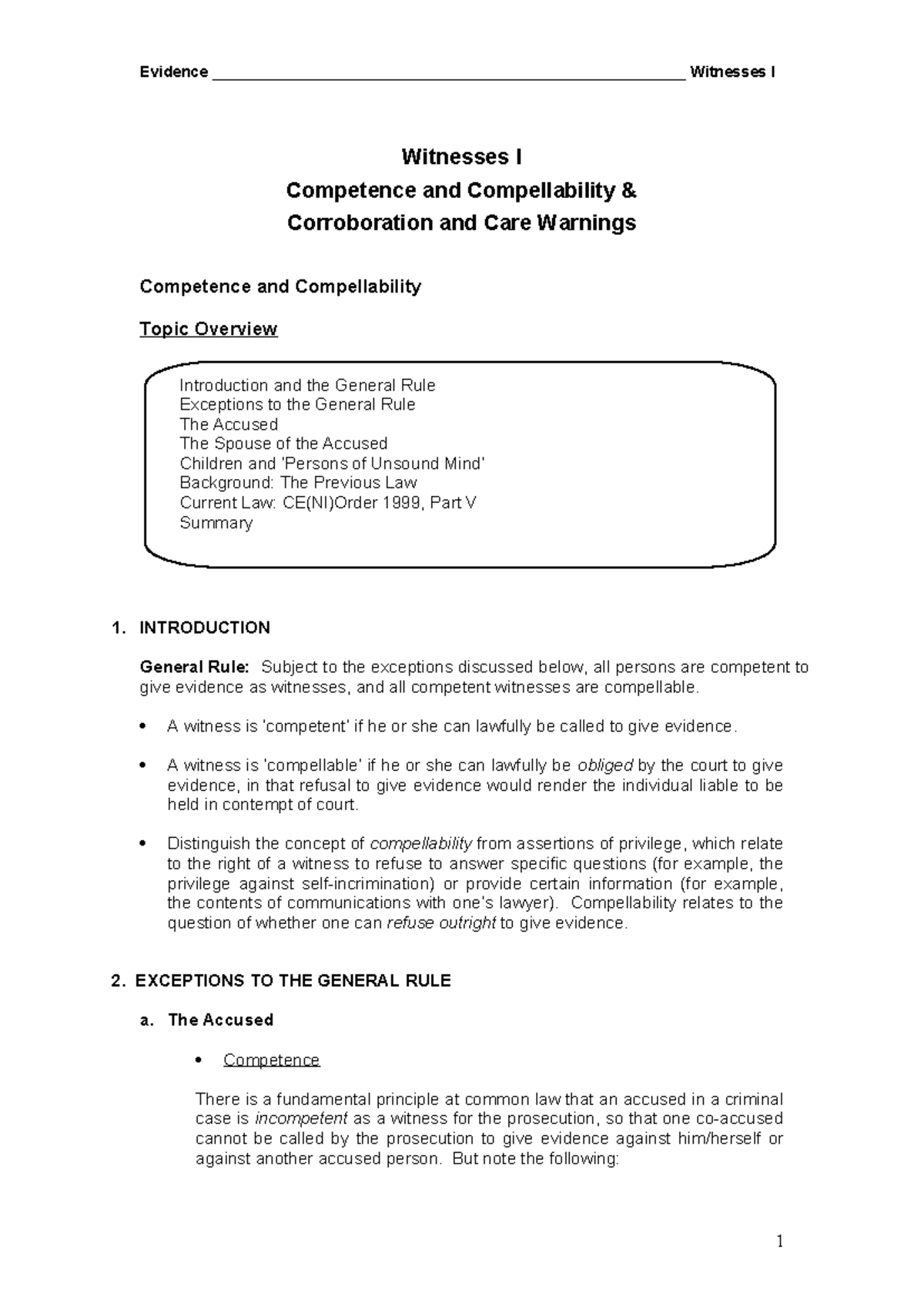 Witnesses 1 - Handout - Witnesses I Competence and Compellability ...