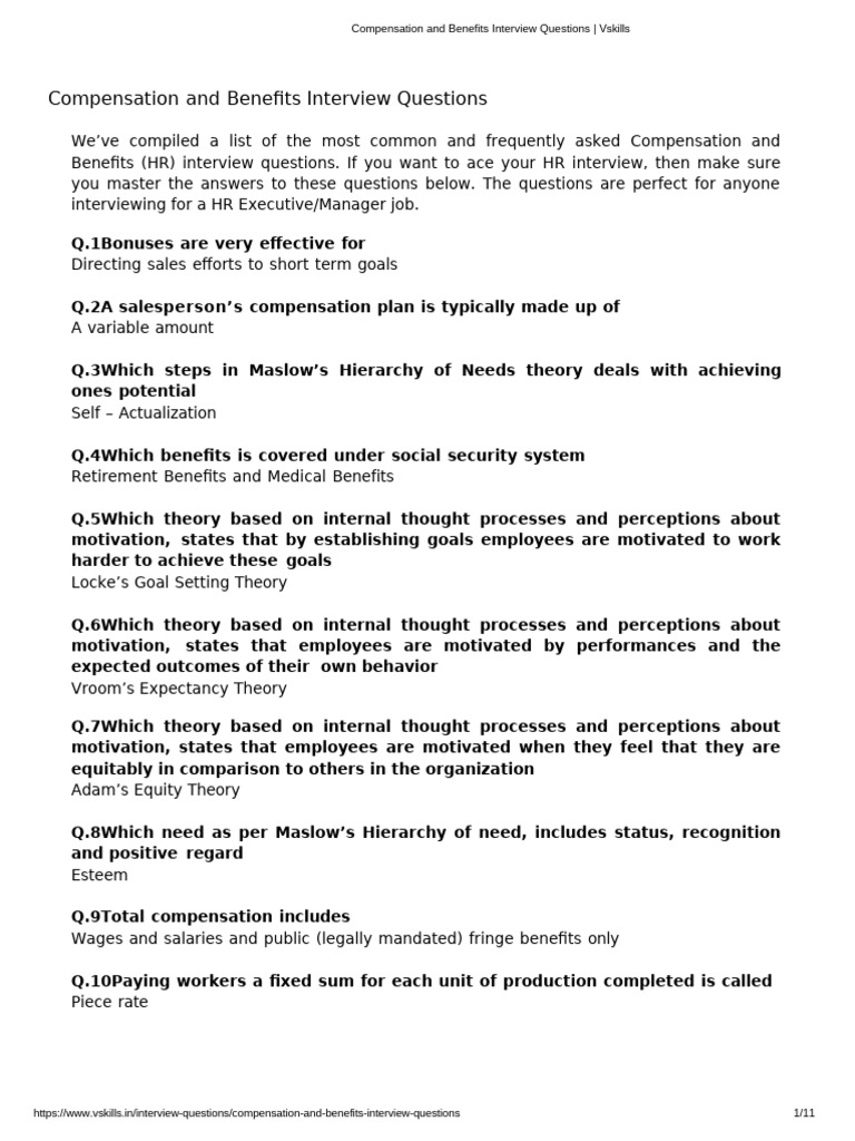 Compensation and Benefits Interview Questions - Vskills | PDF | Cost Of ...