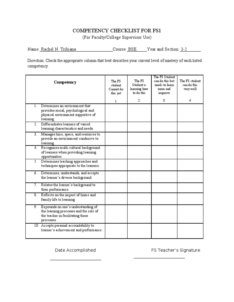 Competency Checklist For Fs1 (2 Copies) | PDF | Wellness