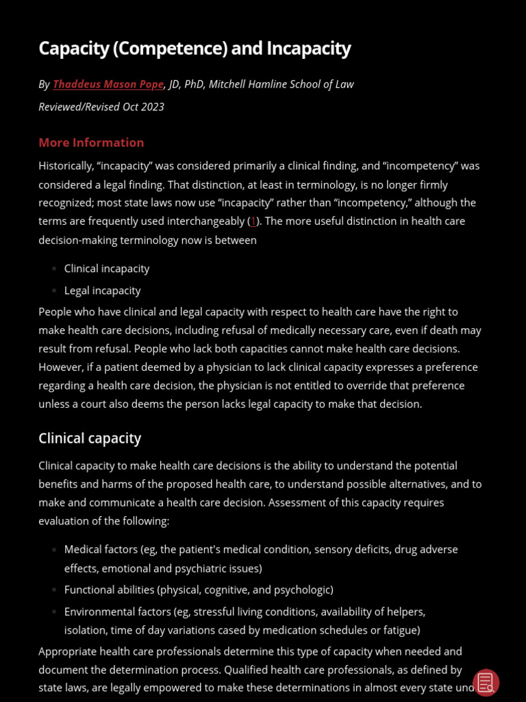Capacity (Competence) and Incapacity | PDF | Conservatorship | Legal ...