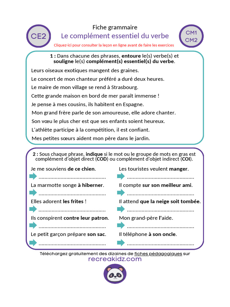 Le Complement Essentiel Du Verbe Ce2 Cm1 Cm2 | PDF | Complément d'objet ...