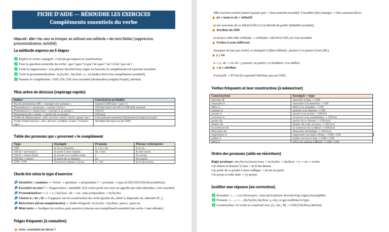 complements essentiels verbes francais - Apprendre, réviser, mémoriser