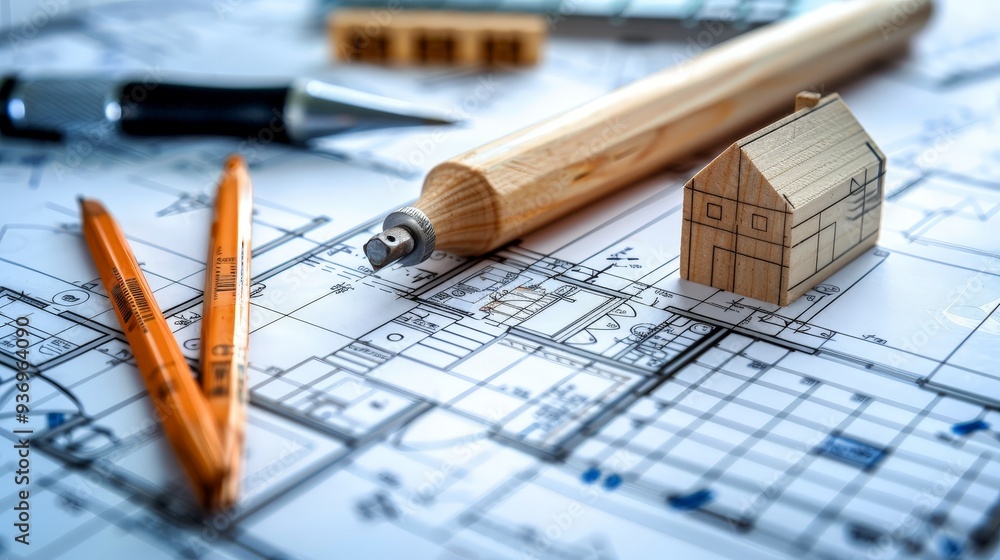 Architectural project with blueprints and model of a private house ...