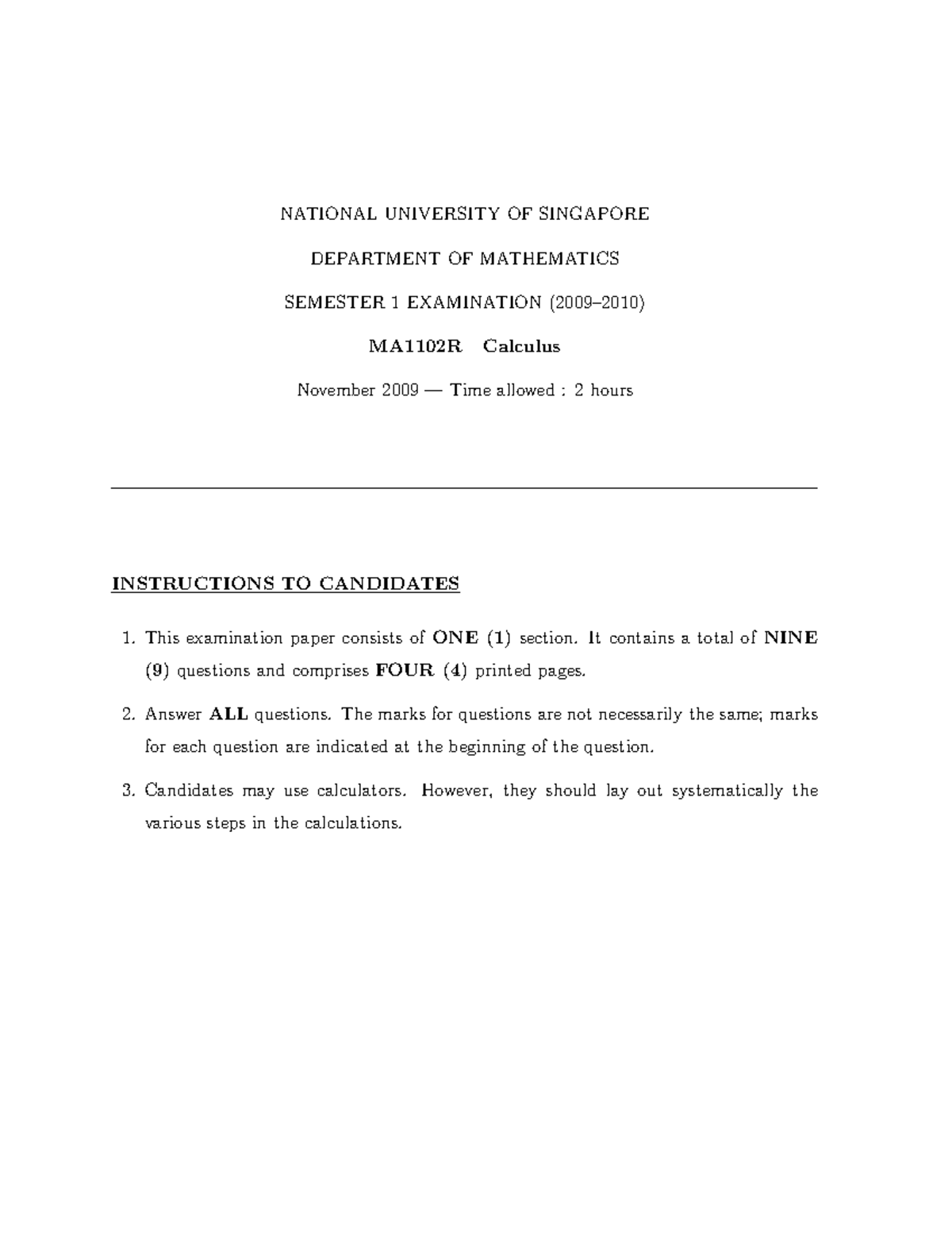 MA1102R Calculus Semester 1 Exam November 2009 Questions & Solutions ...
