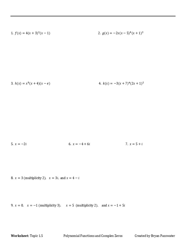 Worksheet B Topic 1.5 Polynomial Functions and Complex Zeros 4 ...