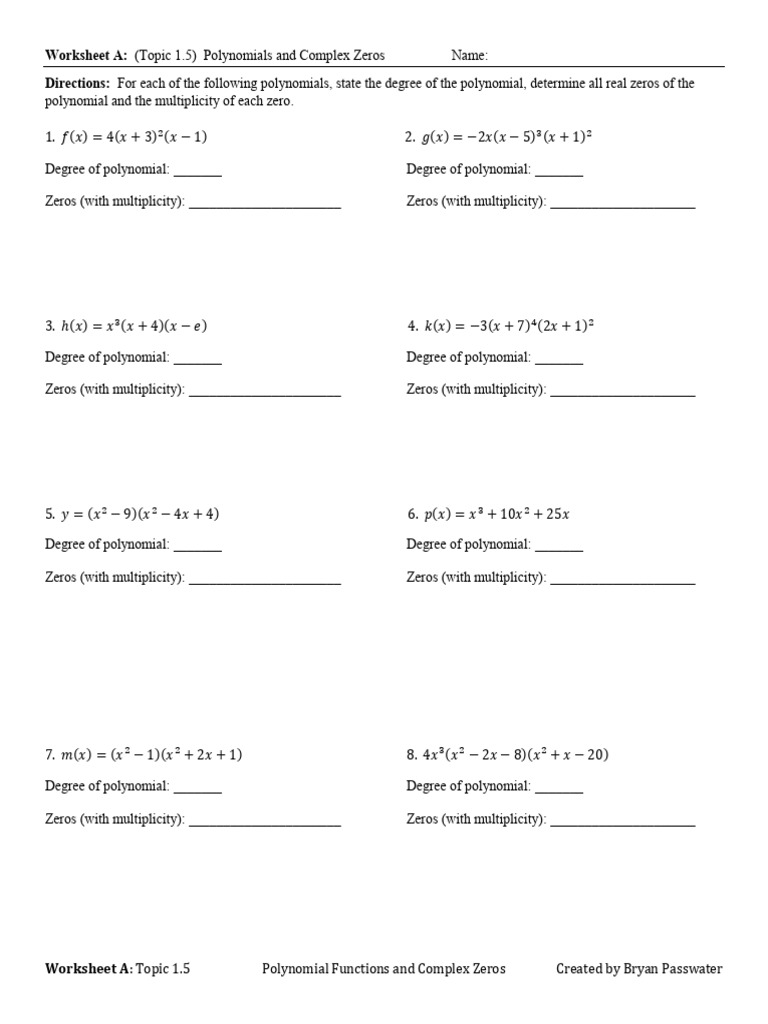 Worksheet A Topic 1.5 Polynomials and Complex Zeros | PDF | Zero Of A ...