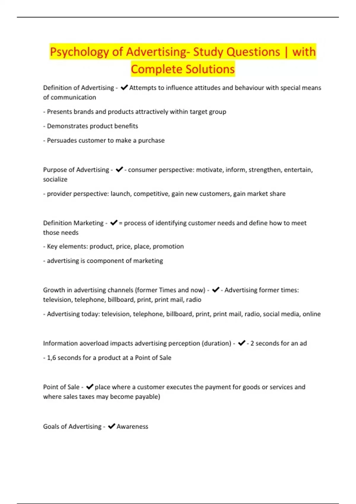 Psychology of Advertising- Study Questions | with Complete Solutions ...