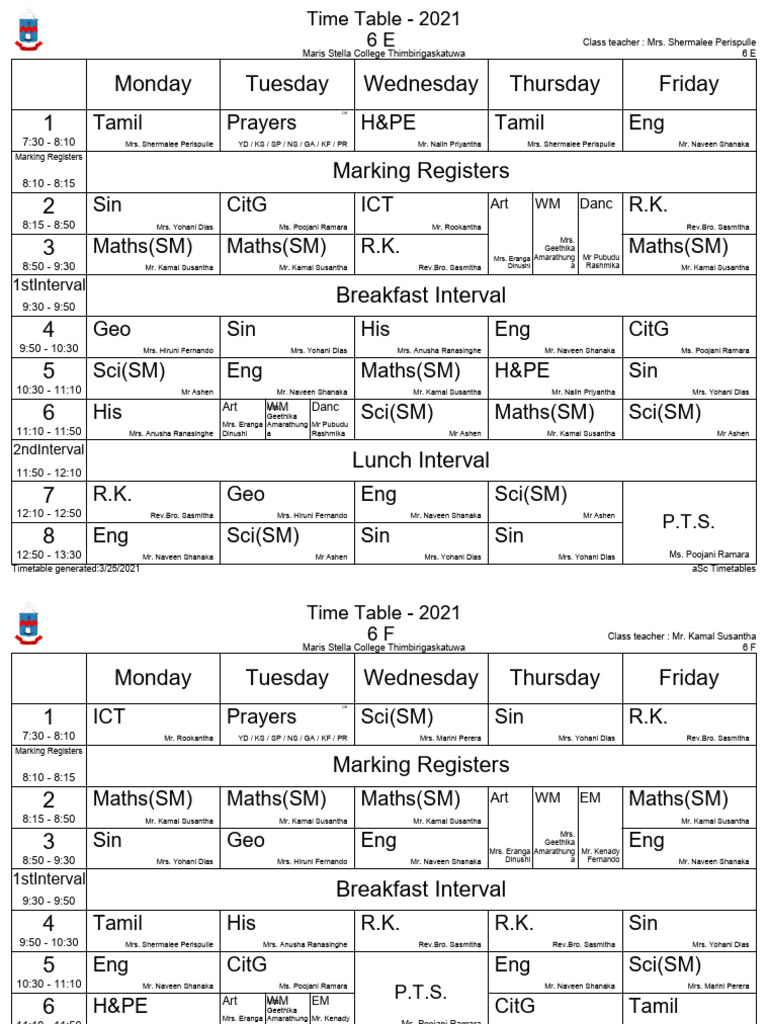 Class Time Tables | PDF