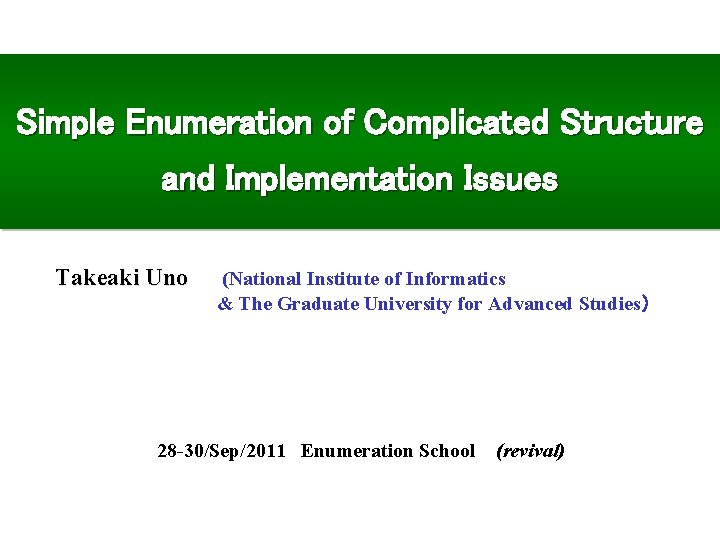 Simple Enumeration of Complicated Structure and Implementation Issues