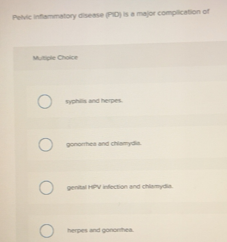 Solved: Pelvic inflammatory disease (PID) is a major complication of ...