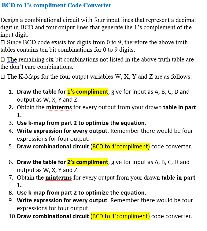 Solved BCD to l's compliment Code Converter Design a | Chegg.com