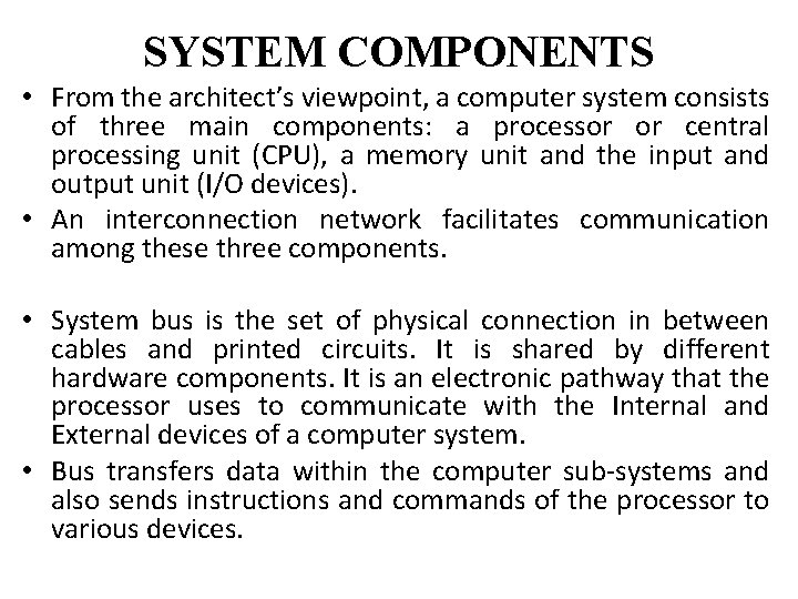 SYSTEM COMPONENTS From the architects viewpoint a computer