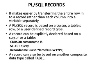 Composite Datatypes: Types: PL/SQL Records PL/SQL Tables Contain ...