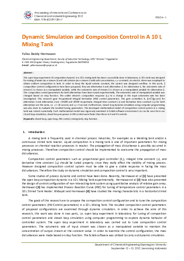 (PDF) Dynamic Simulation and Composition Control in a 10 L Mixing Tank