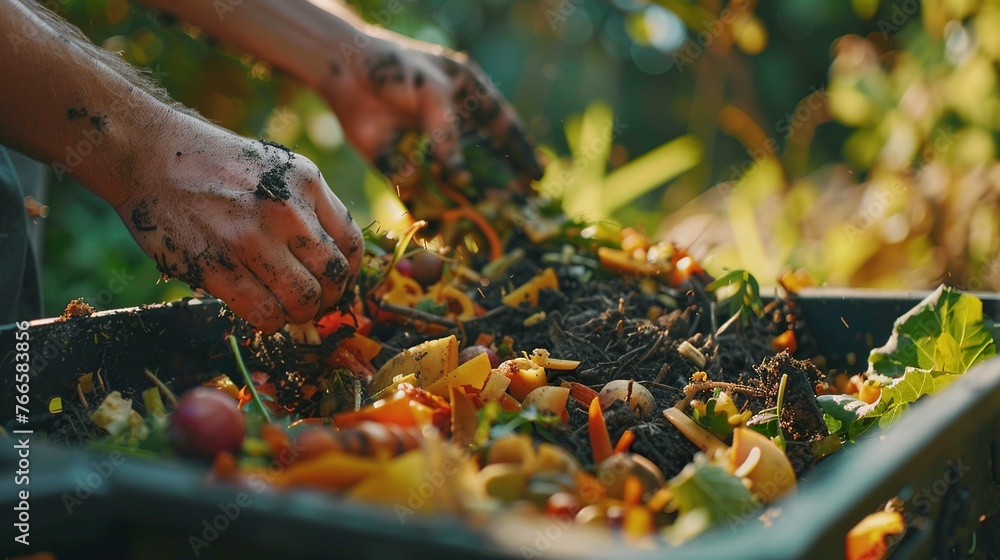 stockphoto, Person composting food waste in backyard compost bin garden ...