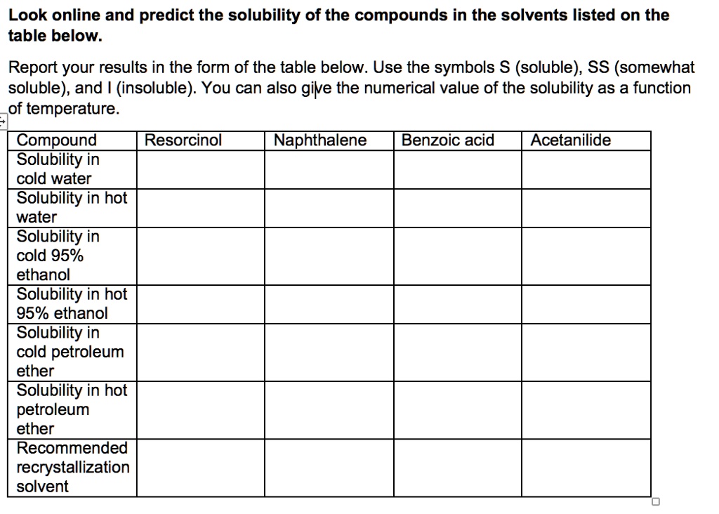 look online and predict the solubility of the compounds in the solvents ...