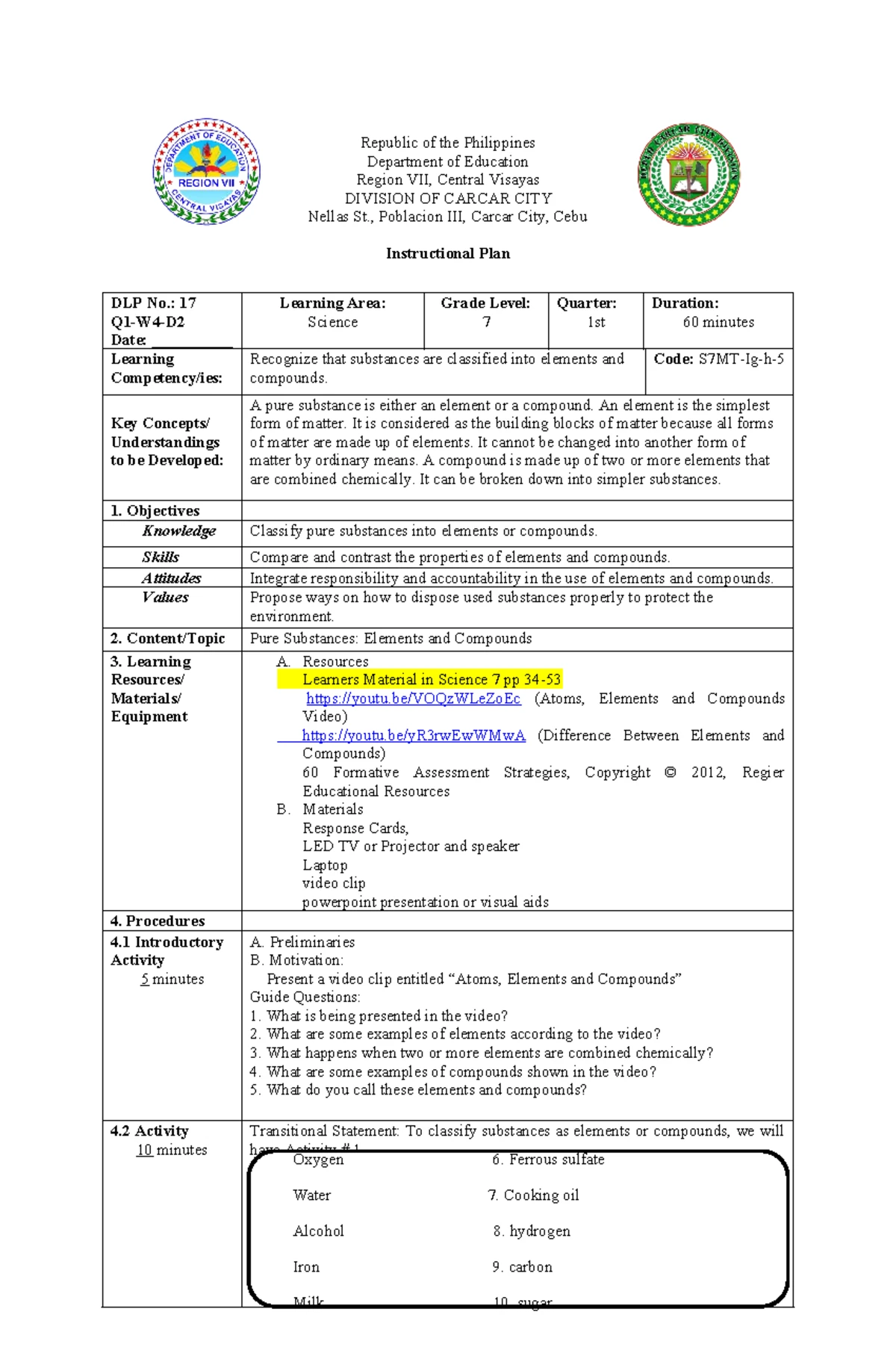 Q1-W4-D3: Science Lesson Plan on Elements & Compounds for Grade 7 - Studocu