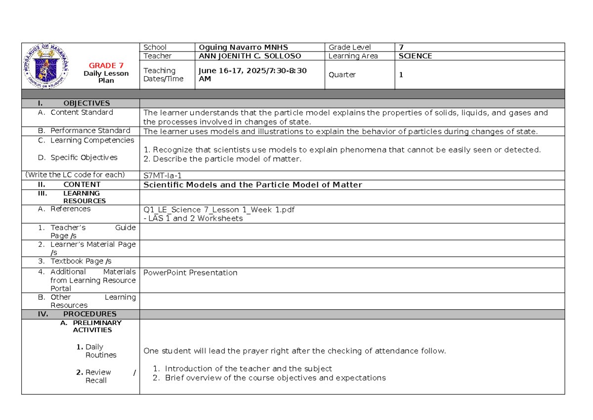 LP-1: Lesson Plan on Particle Nature of Matter for Grade 8 Science ...