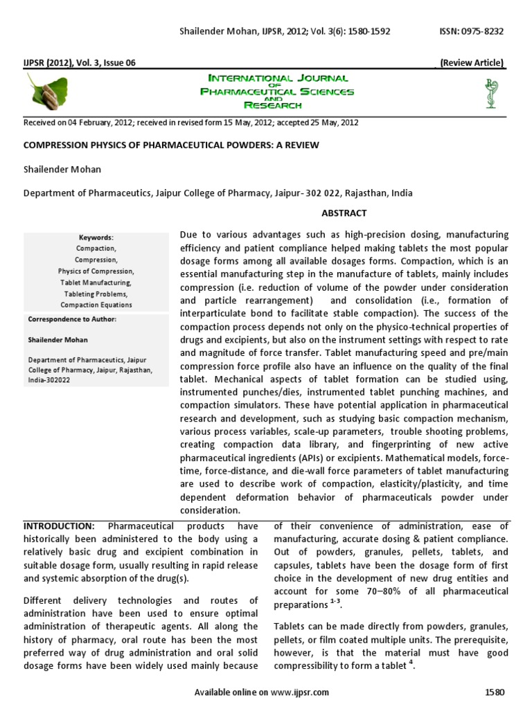 Compression Physics of Pharmaceutical Powders A Review | PDF | Tablet ...