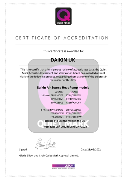 Daikin ASHP Quiet Mark Certificate | Daikin Ltd | NBS Source